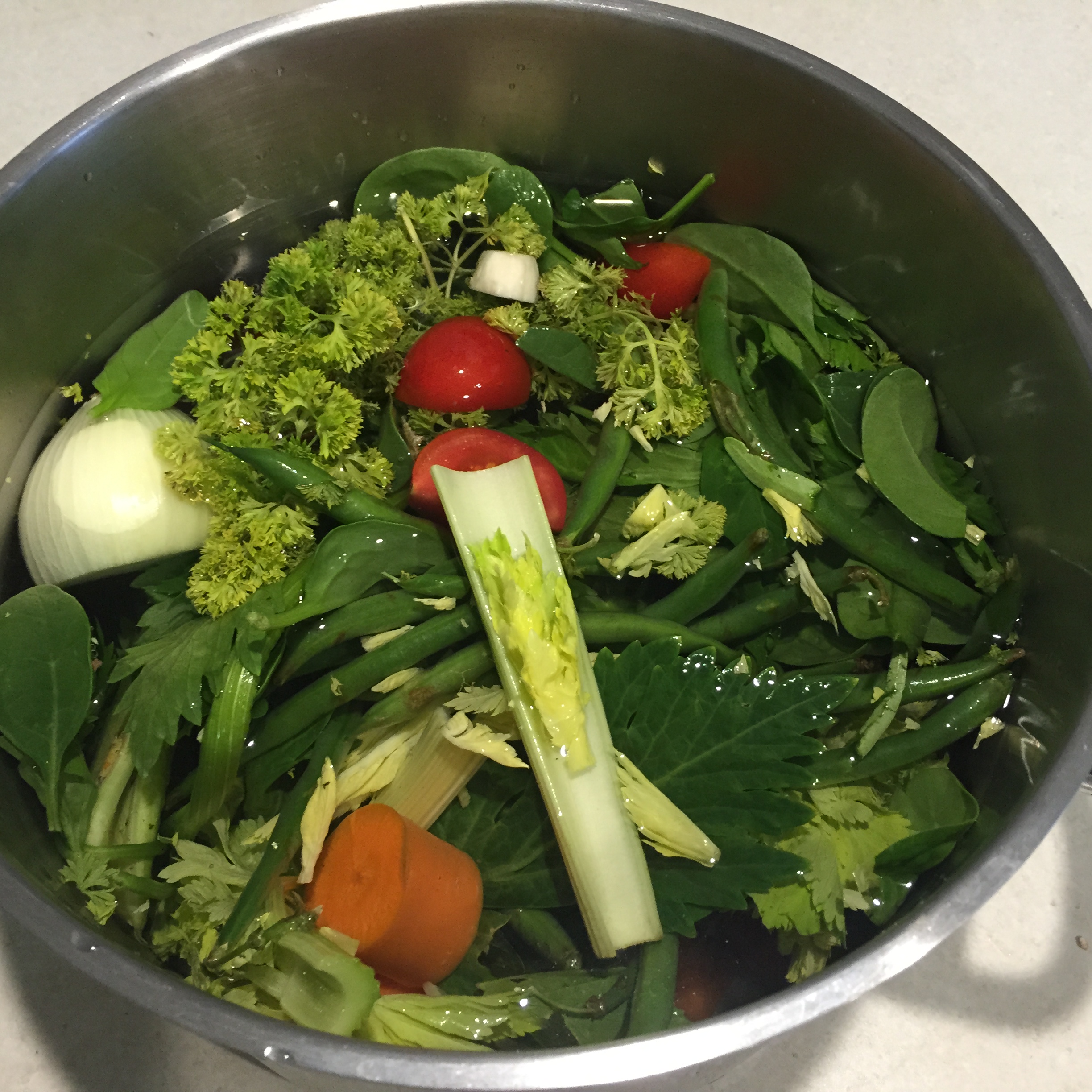 Place all of the vegetables and herbs in a large soup pot.